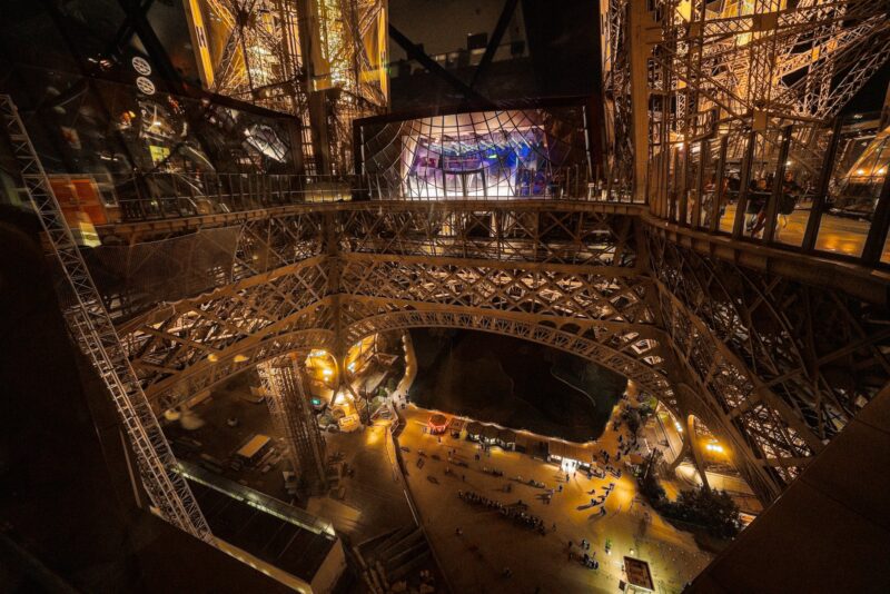 鉄骨構造の隙間から断続的に現れるパリの街並みと、内部を満たす物語の光。そのあいだで来場者の意識は徐々に外部から内部へ移行していく。展望空間は都市を俯瞰する場所から、物語に滞在する場所へと静かに性格を変える。